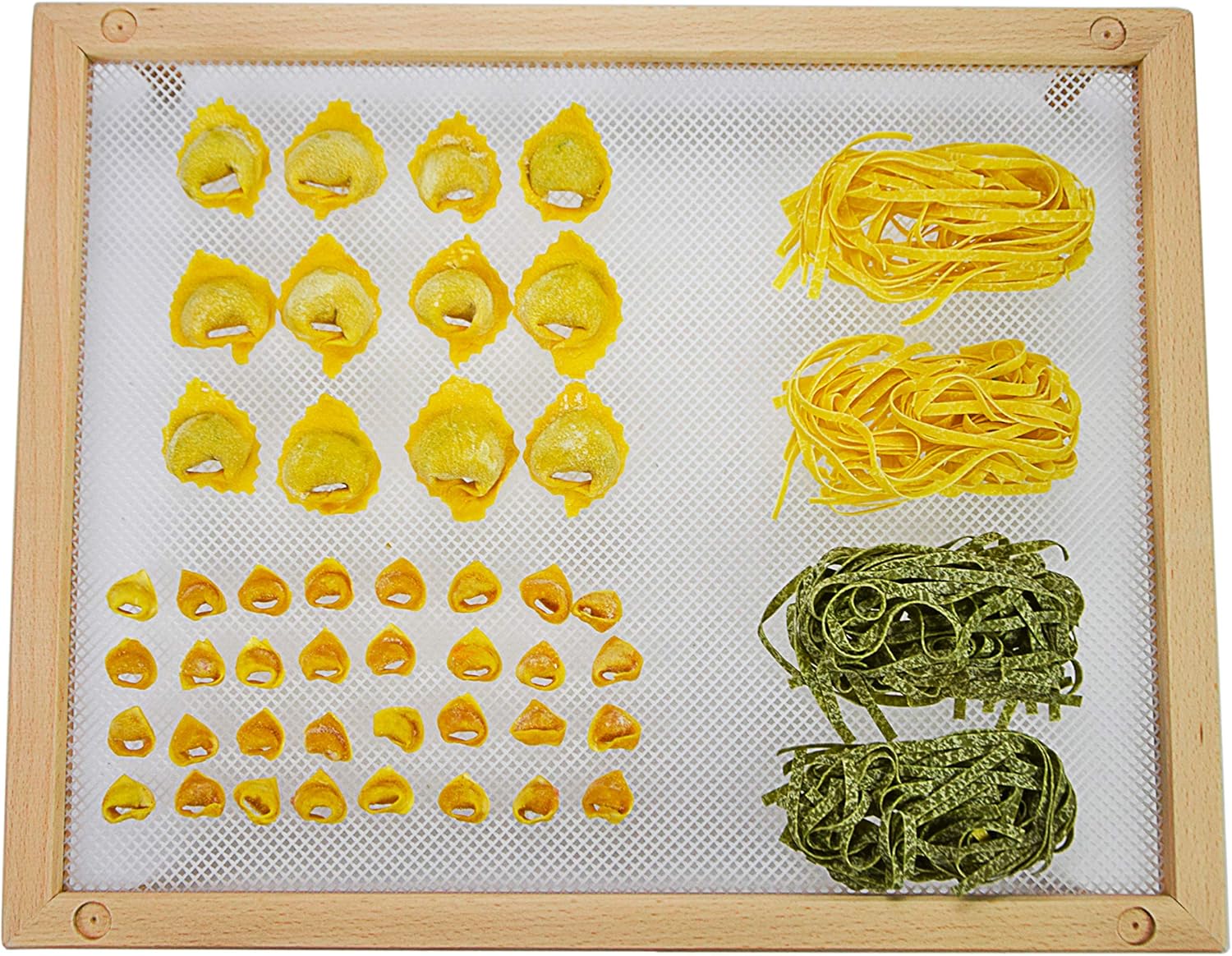 Tray of dry noodles can be stacked to save space in the kitchen, the feet can also be removed. Made of beech wood and fine-meshed reference design. Suitable for drying all types of fresh pasta, mushrooms and fruit. cm 40 x 50.