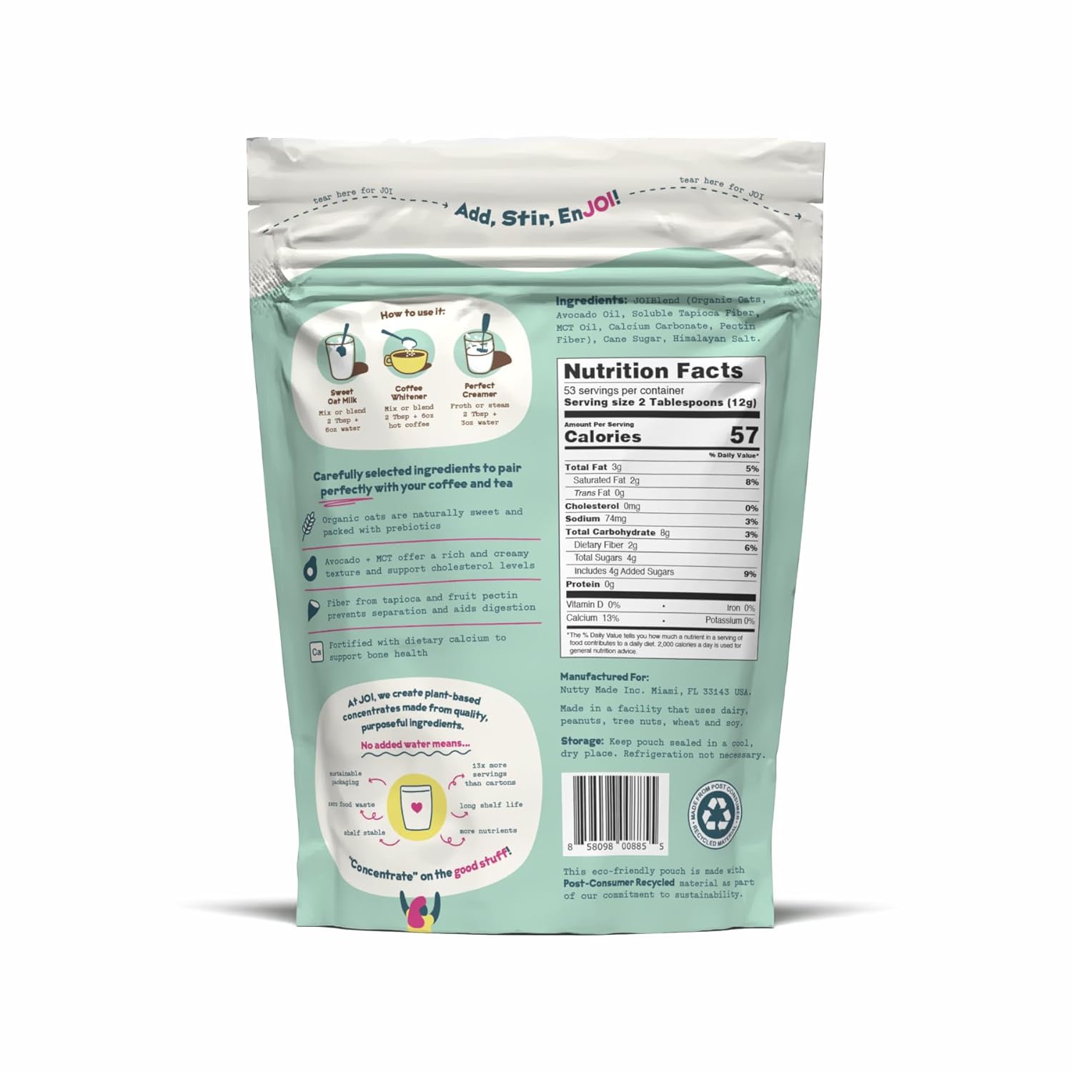 • Just One Ingredient: The future of Coffee Creamer has arrived. JOI’s Oat Milk Creamer is made with whole food ingredients - contains organic, gluten free and sustainably sourced oats, avocado oil, organic MCT oil, tapioca fiber, cane sugar (animal-free), calcium carbonate, pectin fiber and himalayan sea salt. The result: an oat milk product that makes it easy being green (and plant-based). No perservatives, no gums or emulsifiers. Organic, Vegan, non-GMO, and kosher. Add one to two servings to a cup of coffee and mix.